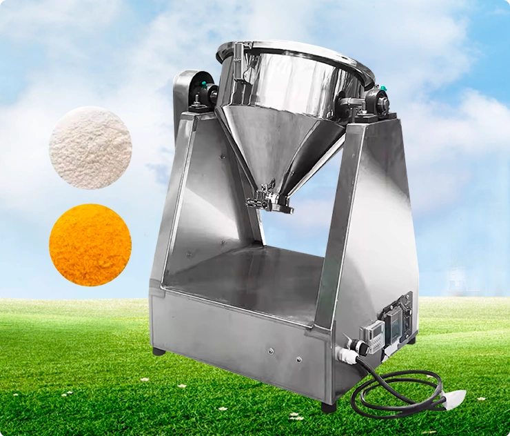 El mezclador de tambor de acero inoxidable gira 360 grados durante la operación, cuenta con una cuchilla de mezcla en la mitad. Cuando está funcionando, las cuchillas agitadoras giran al mismo tiempo, el cilindro giratorio de doble cono hace que la mezcla en el cilindro gire y se mezcle, las cuchillas agitadoras giratorias de alta velocidad rompen los materiales aglomerados, de modo que los materiales se mezclan rápidamente en el cilindro.